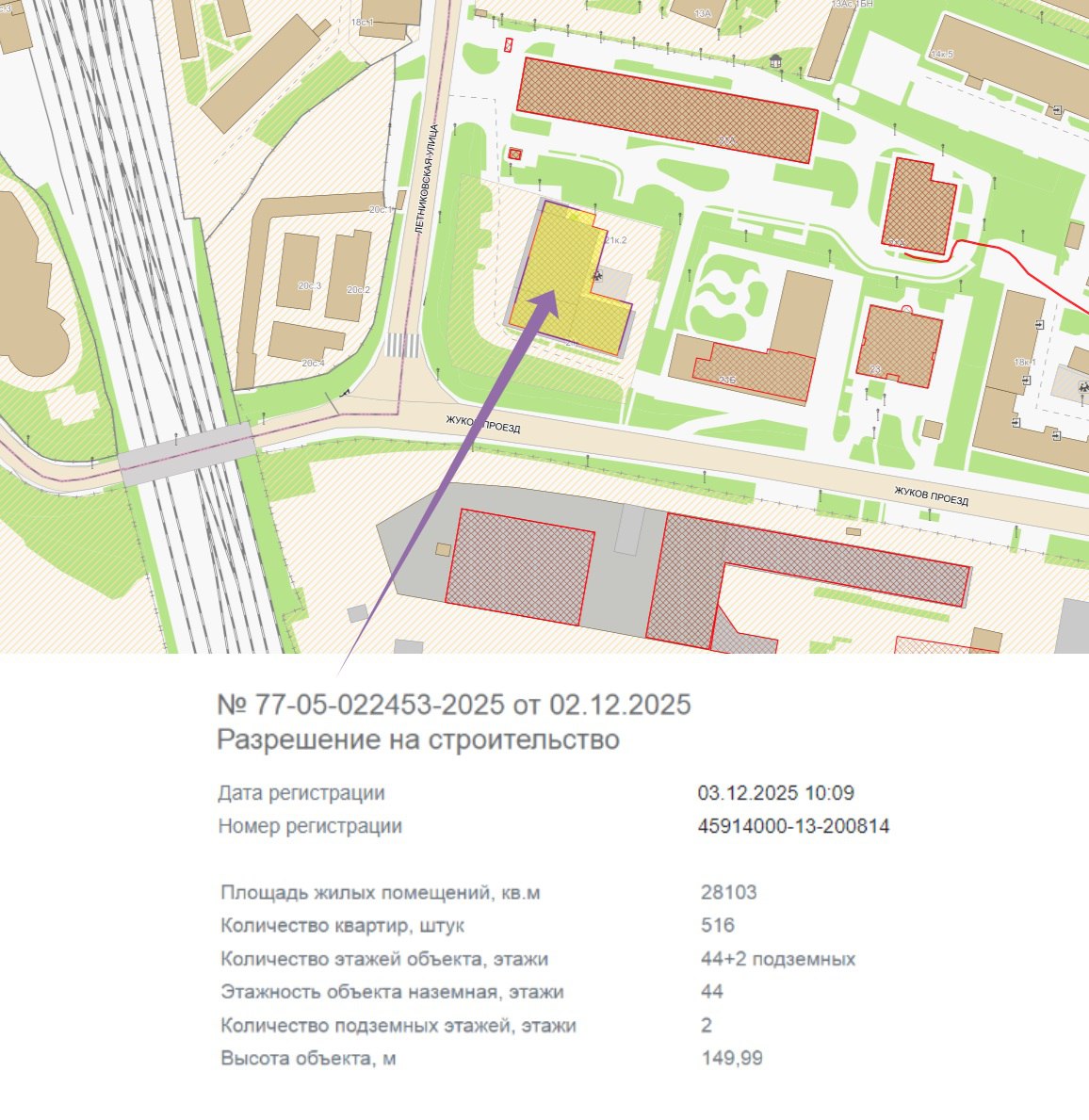 По этому адресу ждем строительство жилого комплекса, девелопер пока не известен. На земельном участке площадью 0,47 га появится 44-этажный жилой комплекс общей площадью 34 768 м². Максимальная высота комплекса составит 149,9 метра.